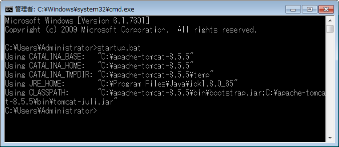 “开始”->“运行”->输入cmd,在命令提示符中输入 startup.bat,之后会弹出tomcat命令框,输出启动日志;