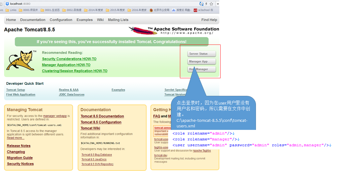 打开浏览器输入http://localhost:8080/ ,如果进入tomcat欢迎界面,那么恭喜你,配置成功。