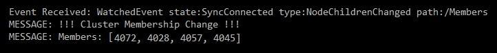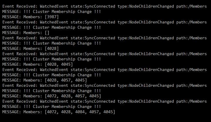 与此相对应,将观察到ClusterMonitor类检测到这些新的ClusterClient类实例,因为它正在监视ZooKeeper树的/Members路径上的事件。 这模拟了一个真正的集群中的节点加入事件。 可以在ClusterMonitor类的终端中看到输出,这与下面的截图中显示的类似: