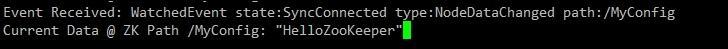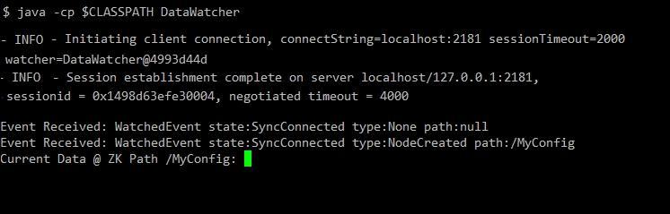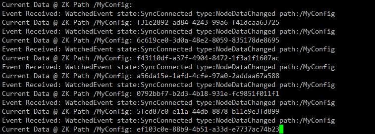 将最初的ZooKeeper特定日志消息记录到控制台后,DataUpdater类运行时没有提示。 它将一个新的UUID字符串设置到ZooKeeper路径/MyConfig的数据字段中。 因此,看到每隔5秒钟,在下面的屏幕截图中显示的输出内容打印在运行DataWatche的终端窗口中: