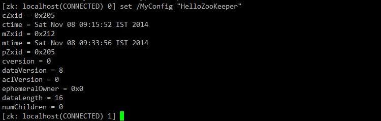 DataWatcher也可以使用ZooKeeper shell进行测试。 继续像以前一样在终端中运行DataWatcher类,并在另一个终端中调用ZooKeeper shell并运行以下屏幕截图中所示的命令:
