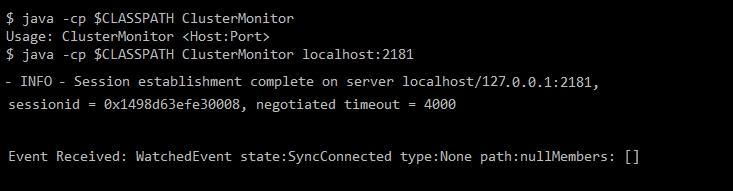 $ java -cp $CLASSPATH ClusterMonitorlocalhost:2181