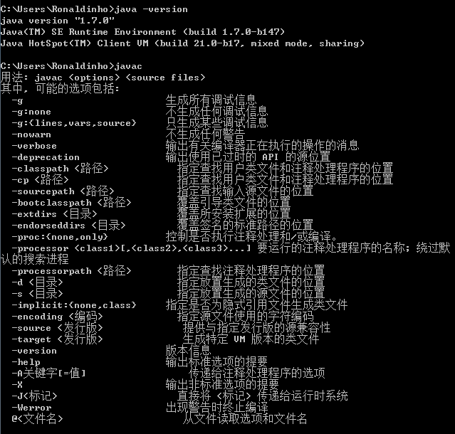 3、在弹出的 DOS 窗口内输入:java -version 会出现版本信息,输入: javac出现 javac 的用法信息 (有很多用法)如果如下图所示则表示配置成功,反之则配置失败
