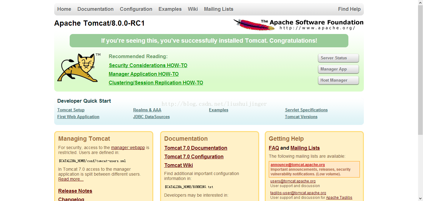 下面就是测试了,浏览器中输入:http://localhost:8080/ 如果出现如下画面就说明成功了,否则就是没配好。