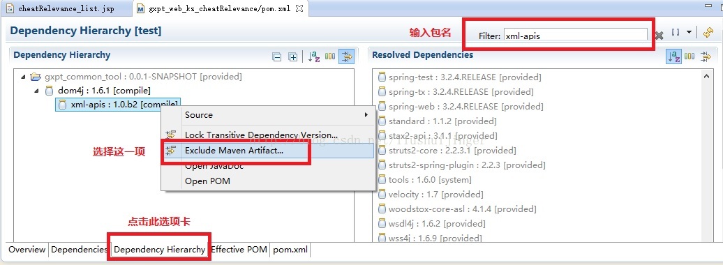 首先,我的项目中用到了dwr,dwr默认依赖这两个包,因此pom文件会在你引入dwr的时候关联这两个包,所以你只是从项目的lib库里删除掉是没用的,因为在打包的时候,Maven还是会根据pom文件里的依赖关系把它们打进去。解决的办法很简单,步骤如下: