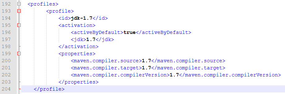 将<profiles>标签范围内的 <profile>...</profile>内容取消注释,根据实际情况配置相应jdk版本