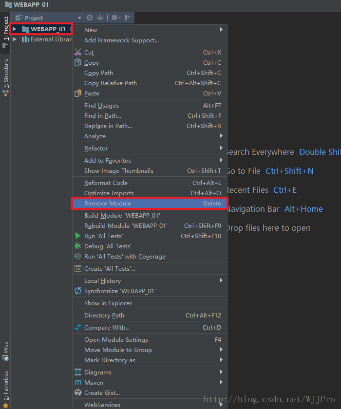 使用IDEA打开需要删除的项目,在项目文件上右击选择 Remove Module 或者按 Delete 键