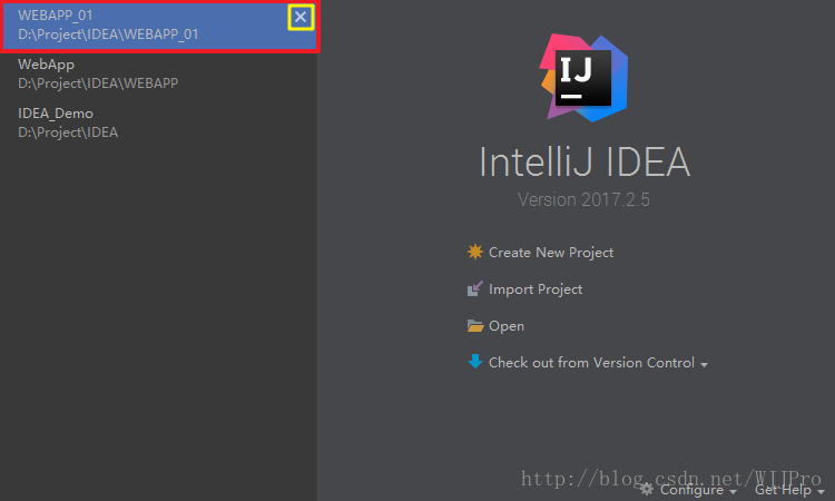随后会出现 IDEA 的欢迎首页,将鼠标放在需要删除的项目上,可以看到右上角有个×删除按钮,点击删除