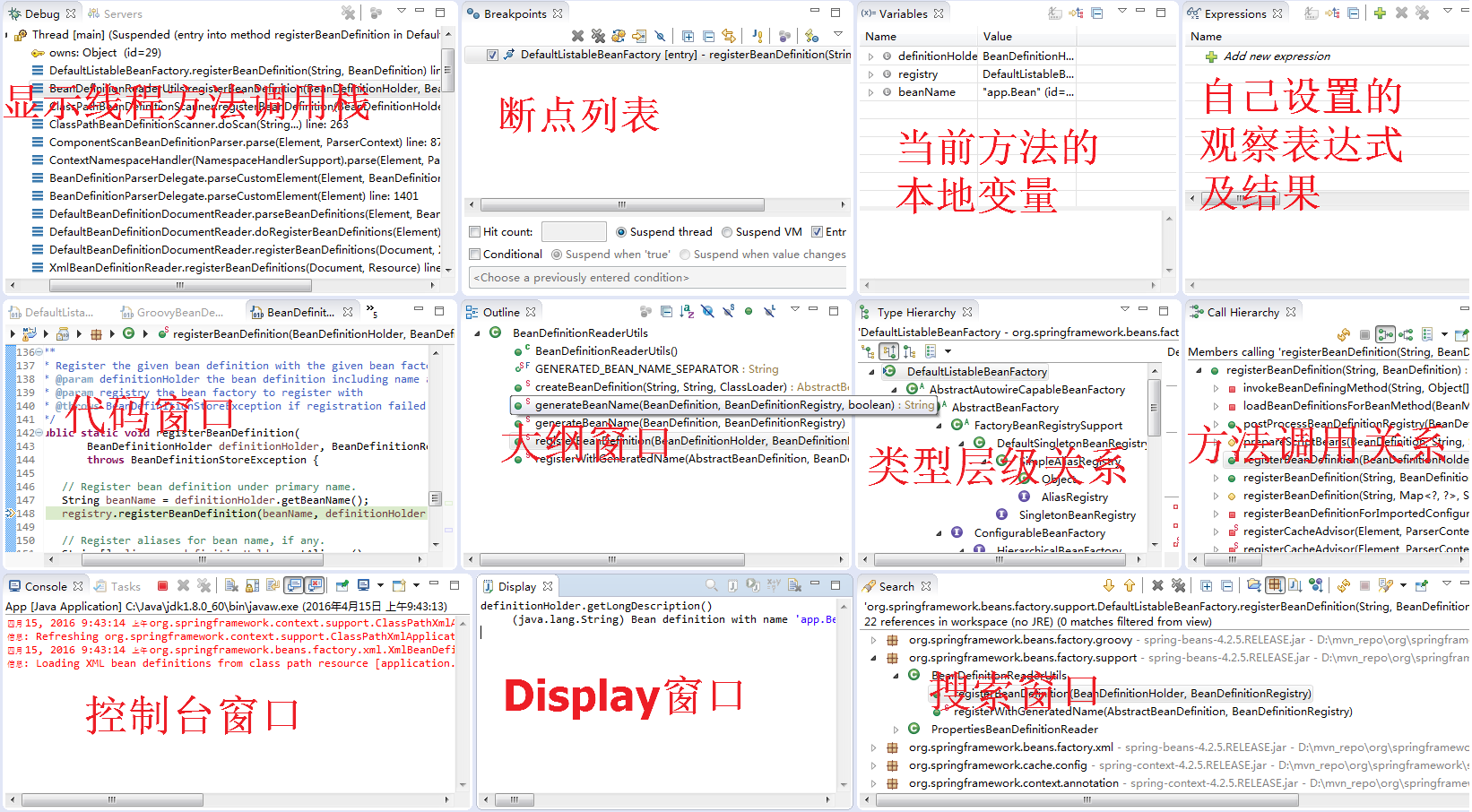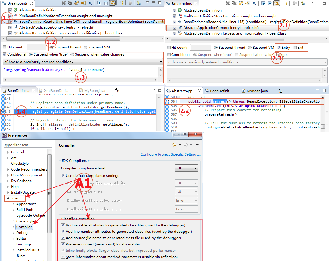 1.3中的条件是,spring在注册Bean定义(registerBeanDefinition)时,如果是org.springframework.demo.MyBean,就挂起线程,可以开始单步调试了。