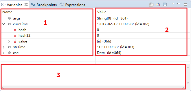 | 变量Variables窗口 | => 显示当前方法的本地变量,非static方法,包含this应用,可以修改变量值 |