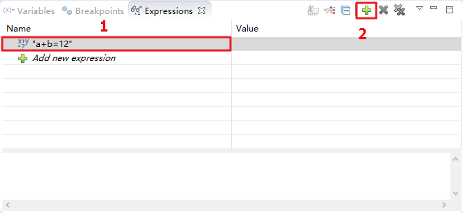 要在 Debug 透视图的编辑器中求表达式的值,选中设置有断点的一整行,并在上下文菜单中选择 Inspect 选项。表达式是在当前堆栈帧的上下文中求值的,其结果显示在 Display 窗口的 Expressions 视图中。 比如我想要计算变量a+b的值,那么就可以在表达式视图中加一个表达式:a+b
