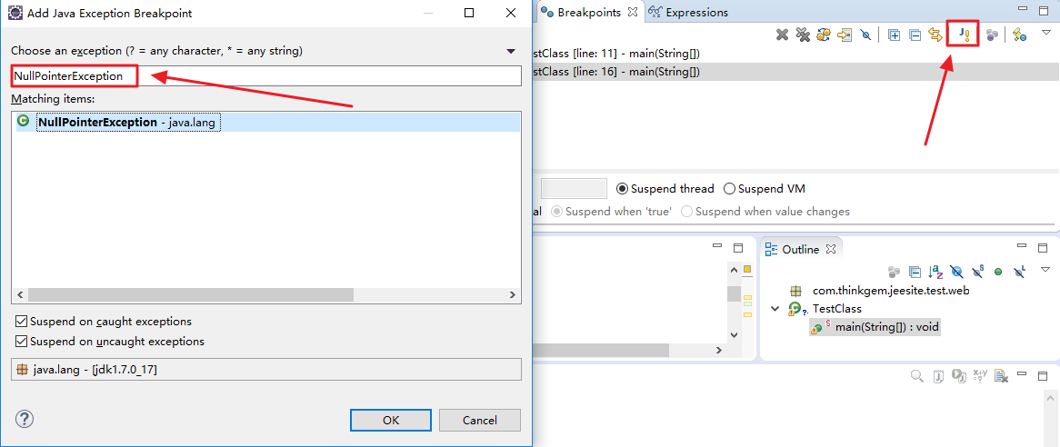 输入想要定位的异常类型,例如NullPointerException,这样系统中抛出任何NullPointerException异常后,都会挂起当前线程,给你机会去定位问题。