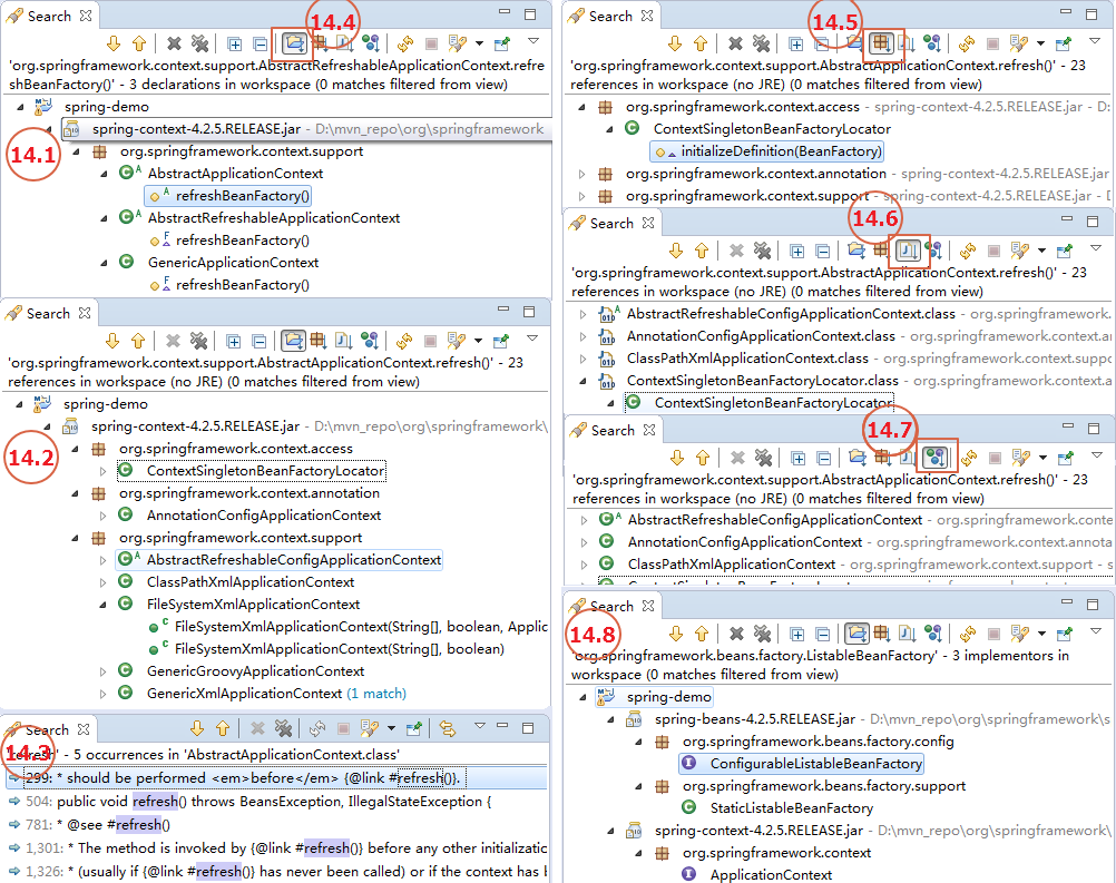 | 搜索结果Search窗口 | => 结合快捷键可以查看变量、方法等在工作空间、项目、工作集中被引用或定义的代码位置 |