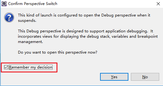 弹出提示,需要切换到调试(Debug)工作区,勾选“Remember my decision”,记住选择,则下次不再提示,然后点击【Yes】。