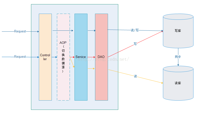 在进入Service之前,使用AOP来做出判断,是使用写库还是读库,判断依据可以根据方法名判断,比如说以query、find、get等开头的就走读库,其他的走写库。