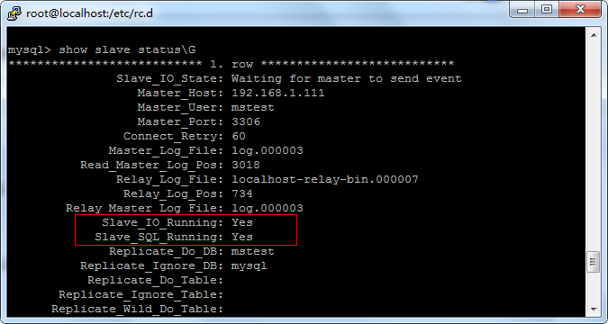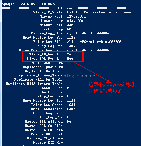 进入mysql,后输入命令:show slave status\G。将显示下图。如果slave_io_running和slave_sql_running都为yes,那么表明可以成功同步了