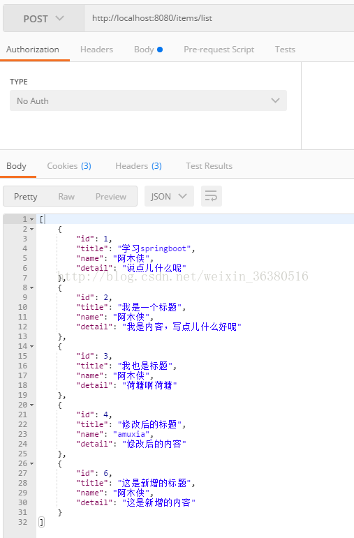 } 我们做一个测试。在postman测试工具中输入http://localhost:8080/items/list