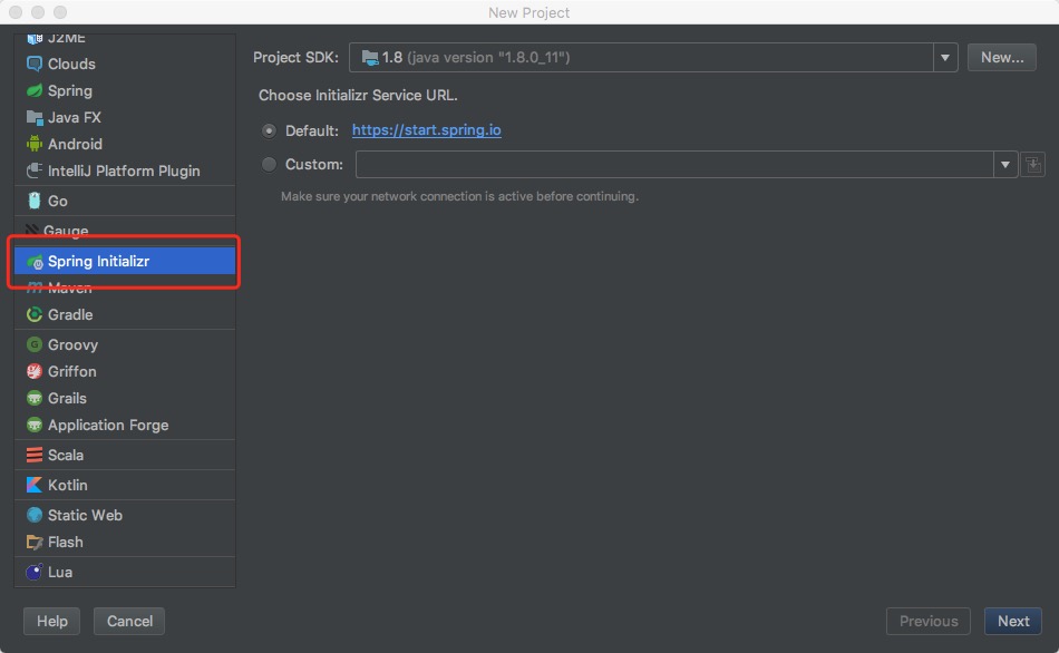 首先,我们需要初始化我们的Spring-Boot工程。通过Intellij的Spring Initializer,新建一个Spring-Boot工程变得十分简单。首先我们在Intellij中选择New一个Project: