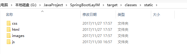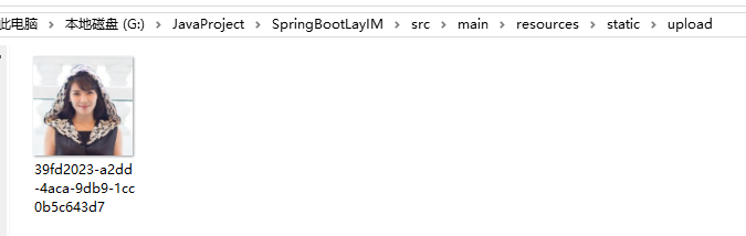 后来在我调试的过程中发现,比如我访问的路径是 /abc.gif,那么他后台就会转换成这个地址:file:///G:/JavaProject/SpringBootLayIM/upload/abc.gif ,所以同理,在本机上直接将这个地址打开也是能够访问的。上文中的地址(file:///..)就是 layim.upload.dir 的值。同样,我把文件夹改为resources/static/upload/下同样适用,因为,通过ResourceLoader,他将文件定位到了服务器的物理地址。