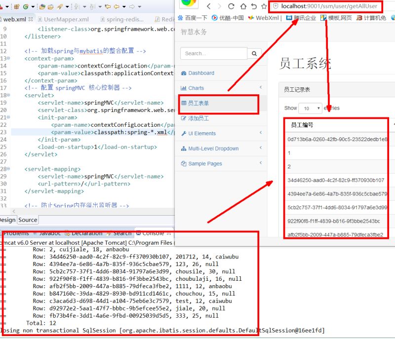 启动成功后,点击员工表单可以触发查询所有员工的方法,第一次进行查询语句可以看到mybatis打印了查询语句,并在redis服务器中更新了一条缓存