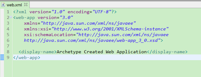 <?xml version="1.0" encoding="UTF-8"?> <web-app version="3.0" xmlns="http://java.sun.com/xml/ns/javaee" xmlns:xsi="http://www.w3.org/2001/XMLSchema-instance" xsi:schemaLocation="http://java.sun.com/xml/ns/javaee http://java.sun.com/xml/ns/javaee/web-app_3_0.xsd"> <display-name>Archetype Created Web Application</display-name> </web-app>