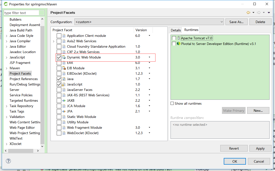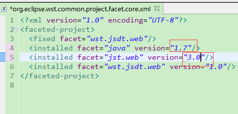 重新打开属性 project Facets,看到这个地方已经修改成3.0; 勾选上tomcat