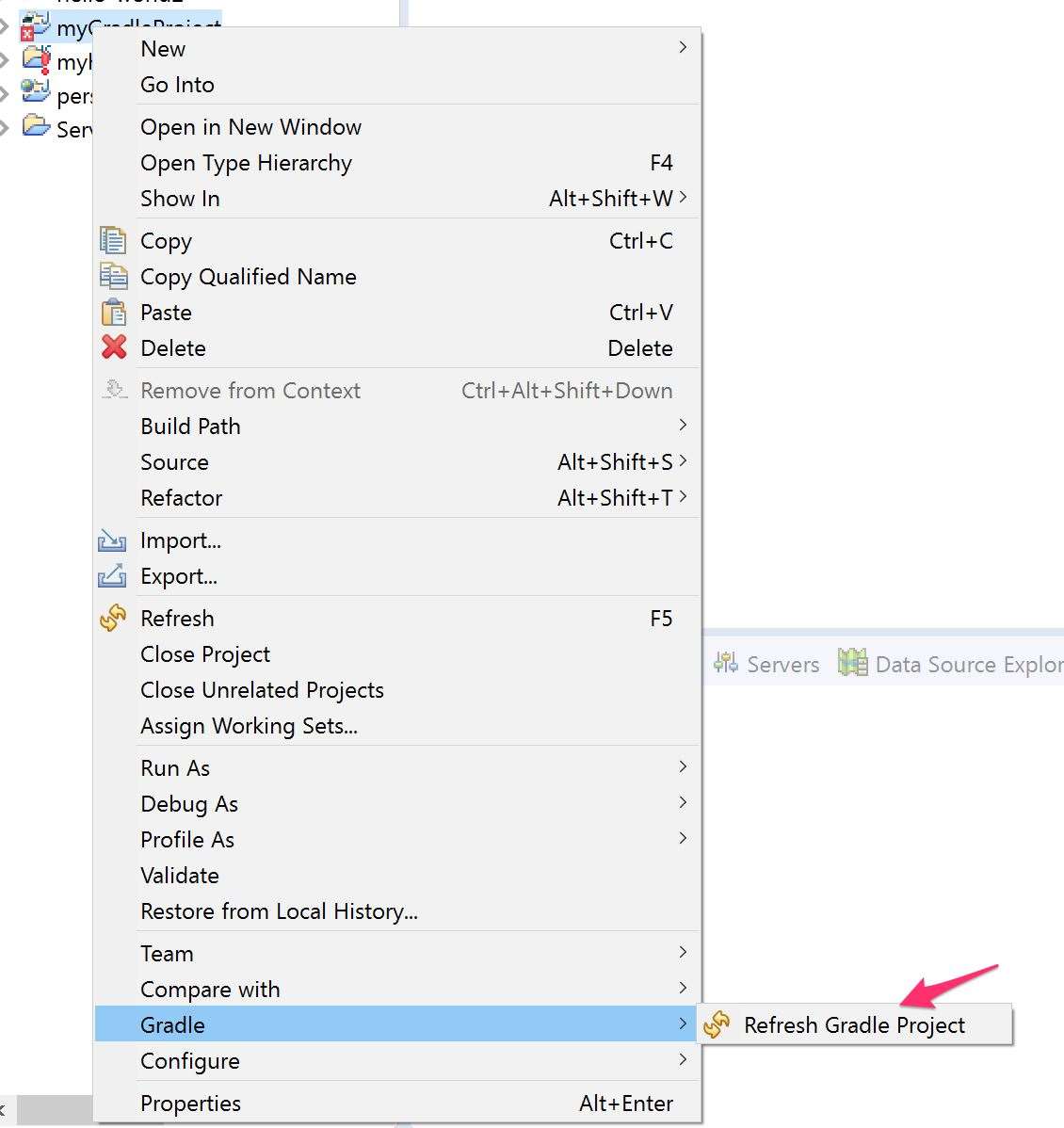 如果build.gradle文件被更新,Eclipse不会自动更新类路径。 选择Gradle Refresh Gradle Project 来更新。