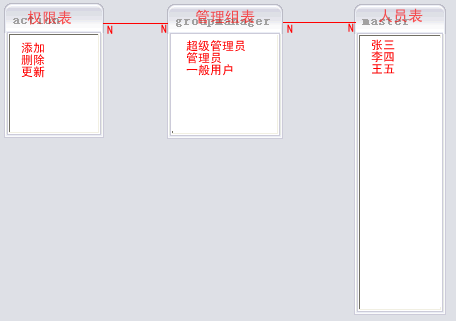 这三个表之间的关系是多对多的,一个权限可能同时属于多个管理组,一个管理组中也可能同时包含多个权限。同样的道理,一个人员可能同时属于多个管理组,而一个管理组中也可能同时包含多个人员。如下图: