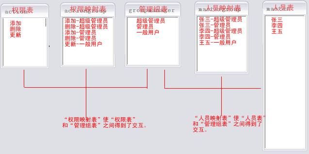 其实,管理组表中仅仅记录着组的基本信息,如名称,组id等等。至于一个组中人员的详细信息,以及该组能够执行的权限的详细信息,都记录在人员表和权限表中。两张映射表才真正记录着一个组有哪些人员,能够执行哪些权限。通过两张映射表的衔接,三张实体表之间的交互才得以实现,从而完成了需求中提到的“组”操作。