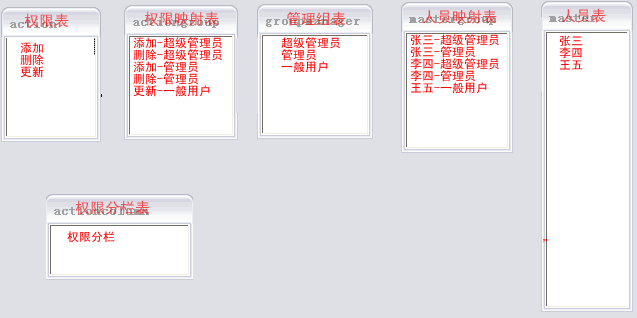 首先,action表(以下简称为“权限表”),gorupmanager表(以下简称为“管理组表”),以及master表(以下简称为“人员表”),是三张实体表,它们依次记录着“权限”的信息,“管理组”的信息和“人员”的信息。如下图: