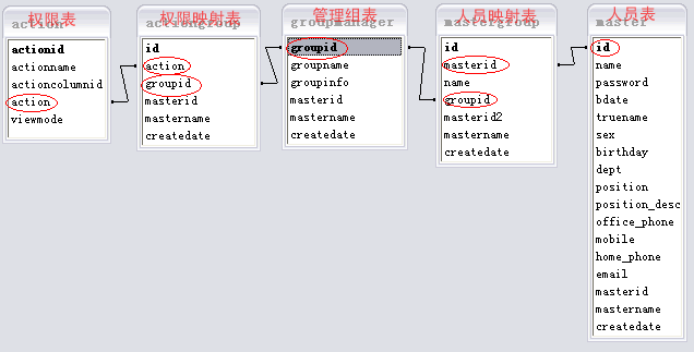 由于这三张表之间存在着多对多的关系,那么它们之间的交互,最好使用另外两张表来完成。而这两张表起着映射的作用,分别是“actiongroup”表(以下简称“权限映射表”)和“mastergroup”表(以下简称“人员映射表”),前者映射了权限表与管理组表之间的交互。后者映射了人员表与管理组表之间的交互。如下图: