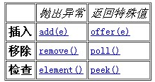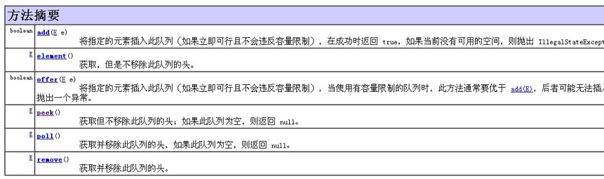 Queue使用时要尽量避免Collection的add()和remove()方法,而是要使用offer()来加入元素,使用poll()来获取并移出元素。它们的优点是通过返回值可以判断成功与否,add()和remove()方法在失败的时候会抛出异常。如果要使用前端而不移出该元素,使用element()或者peek()方法。