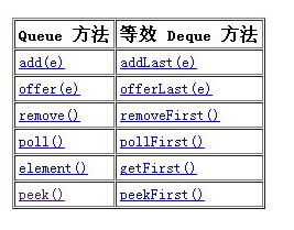 a、在将双端队列用作队列时,将得到 FIFO(先进先出)行为。将元素添加到双端队列的末尾,从双端队列的开头移除元素。从 Queue 接口继承的方法完全等效于 Deque 方法,如下表所示: