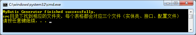 @echo off ::注释: 将这个脚本 复制到新建文本文件,文件后缀名 .bat 即可。 java -jar mybatis-generator-core-1.3.2.jar -configfile generatorConfig.xml -overwrite echo src目录下找到相应的文件夹,每个表格都会对应三个文件(实体类、接口、配置文件) PAUSE