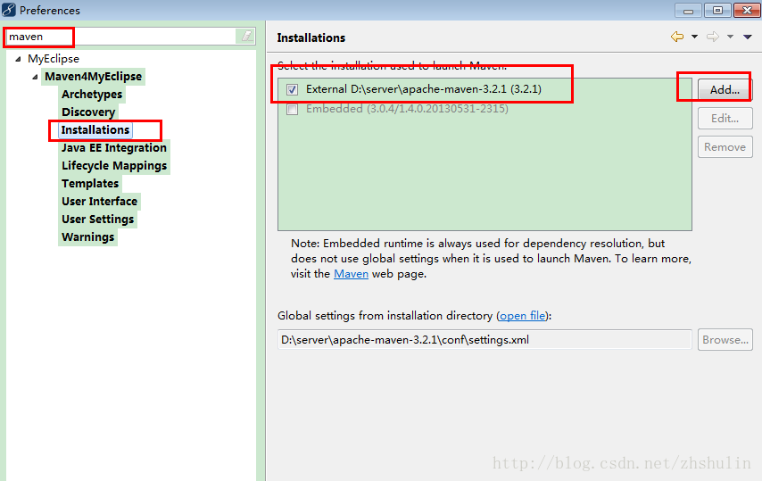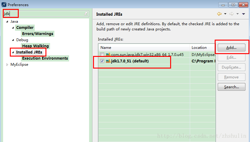 我是用的是MyEclipse2014,这个大家下载了之后也是一路安装到底,中间可以选择是安装32位还是64位。完成之后我们启动MyEclipse,设置好工作路径,也可以直接默认。我们打开window-->preference输入jdk,安装下图,选择Eclipse默认的JRE为自己安装的,而不是eclipse自带的。