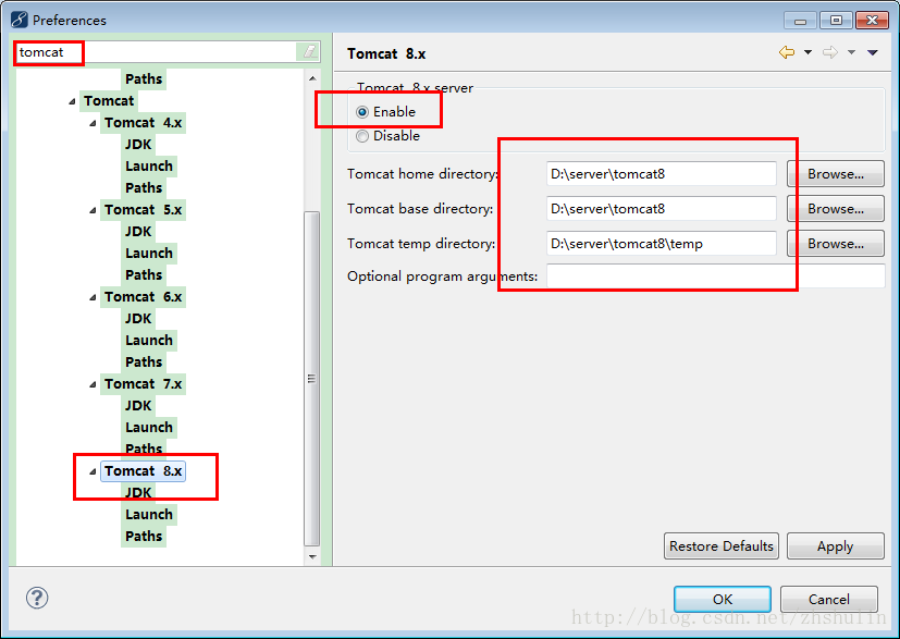 项目开发的时候最好不要是用MyEclipse自带的Tomcat,所以需要配置我们安装好的tomcat。打开window-->preference输入tomcat,按照下图进行配置即可,其他版本的tomcat对应着配置就可以了。