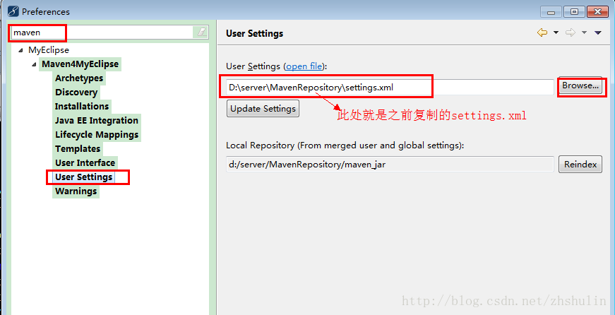 MAVEN中还有一个重要的配置就是数据仓库的路径配置,我们找到MAVEN的安装路径,进入conf-->打开settings.xml,找到localRepository标签,此时是被注释掉的,我们解除注释,然后配置一个路径,例如:d:/server/MavenRepository/maven_jar,这样以后MAVEN管理下载的jar包都会在这个路径下。当然我们需要建这样一个目录结构,然后还要讲settings.xml复制一份到d:/server/MavenRepository下,这个在与MyEclipse集成时会用到。