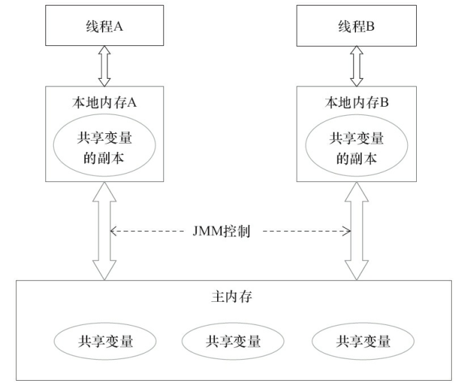 JMM将这些硬件做的优化抽象成每个线程都有一个本地内存。需要读写共享变量时,从主内存中拷贝一份到本地内存。当写共享变量时,先写到本地内存中去,在将来某个时间再刷新到主内存中。当再次读共享变量时,则只会从本地内存中读取。