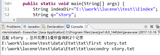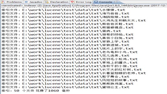 执行主代码后结果如图:设计在索引某个文件的时候返回文件“索引文件:+文件路径”,且计算输出索引全部文件花费的时间。