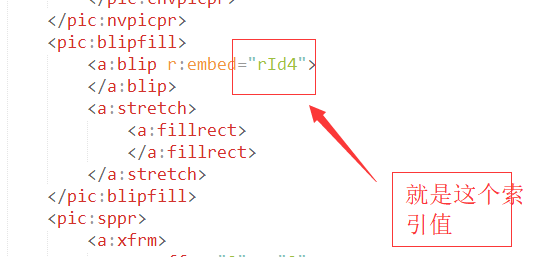 <pic:blipfill>这个是graphic文档的子节点,定义了图片内容的索引,具体来说,poi能根据这个名称拿到图片所对应的资源,而获取文档图片位置的关键也就在这里