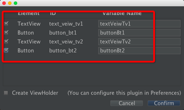 选择“Confirm”后,就会自动生成各个在布局文件中带有id 属性的view的注解形式