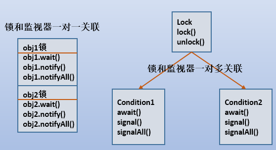 即使有多个监视器,但只要它们关联的是同一个锁对象,就可以跨监视器操作对方线程。例如condition1中的线程可以执行condition2.signal()来唤醒condition2线程池中的某个线程。