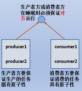 第1个问题考虑的是某一方多线程的问题,第2个问题考虑的是两方如何能和谐配合完成生产消费问题。也就是如何保证生产方和消费方一方活动的同时另一方睡眠。只需在某一方执行完同步任务时,唤醒另一方即可。