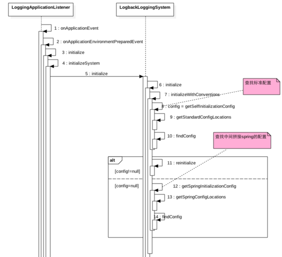 那么我们就去看看日志系统是如何查找并解析日志配置文件的,SpringBoot中是使用LoggingApplicationListener这个类来进行日志系统的初始化的。LoggingApplicationListener实现了ApplicationListener接口,那么我们通过时序图看LoggingApplicationListener的onApplicationEvent方法做了啥:
