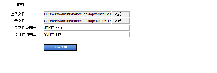 <!DOCTYPE HTML PUBLIC "-//W3C//DTD HTML 4.01 Transitional//EN"> <html> <head> <title>上传文件</title> <meta http-equiv="keywords" content="keyword1,keyword2,keyword3"> <meta http-equiv="description" content="this is my page"> <meta http-equiv="content-type" content="text/html; charset=UTF-8"> <link rel="stylesheet" type="text/css" href="css/style.css"> </head> <body> <form action="servlet/UploadServlet" method="post" enctype="multipart/form-data"> <div align="center"><br/> <fieldset style="width:90%"> <legend>上传文件</legend><br/> <div class='line'> <div align='left' class="leftDiv">上传文件一</div> <div align='left' class="rightDiv"> <input type="file" name="file1" class="text"> </div> </div> <div class='line'> <div align='left' class="leftDiv">上传文件二</div> <div align='left' class="rightDiv"> <input type="file" name="file2" class="text"> </div> </div> <div class='line'> <div align='left' class="leftDiv">上传文件说明一</div> <div align='left' class="rightDiv"><input type="text" name="description1" class="text"></div> </div> <div class='line'> <div align='left' class="leftDiv">上传文件说明二</div> <div align='left' class="rightDiv"><input type="text" name="description2" class="text"></div> </div> <div class='line'> <div align='left' class="leftDiv"></div> <div align='left' class="rightDiv"><br/> <input type="submit" value=" 上传文件 " class="button"> </div> </div> </fieldset> </div> </form> </body> </html>