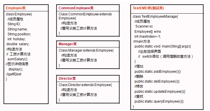 员工父类一个,普通员工,经理,董事长子类各一个,分别重写父类的工资方法。最后一个测试类。