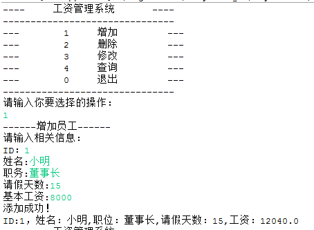 System.out.println("ID:"+ID+",姓名:"+name+",职位:"+position+",请假天数:"+holiday+",工资:"+salary);