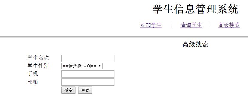 在高级搜索页面,有四个选项可以选择:学生姓名,性别,手机号,邮箱。四个条件可以任意排列组合。之前写QT项目时也遇到过这个问题,当时用的就是拼接SQL语句,但是没想到用“where 1=1”,很费事。下面的代码很经典,并且用到了模糊查询,使搜索更人性化。