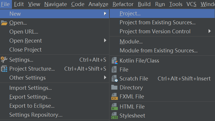 点击坐上角file ---》选择new ---》点击project... 如下图所示: