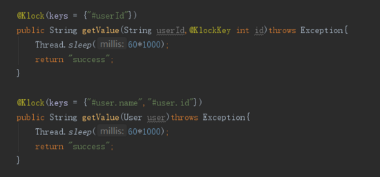 3.在需要加分布式锁的方法上,添加注解@Klock,如: